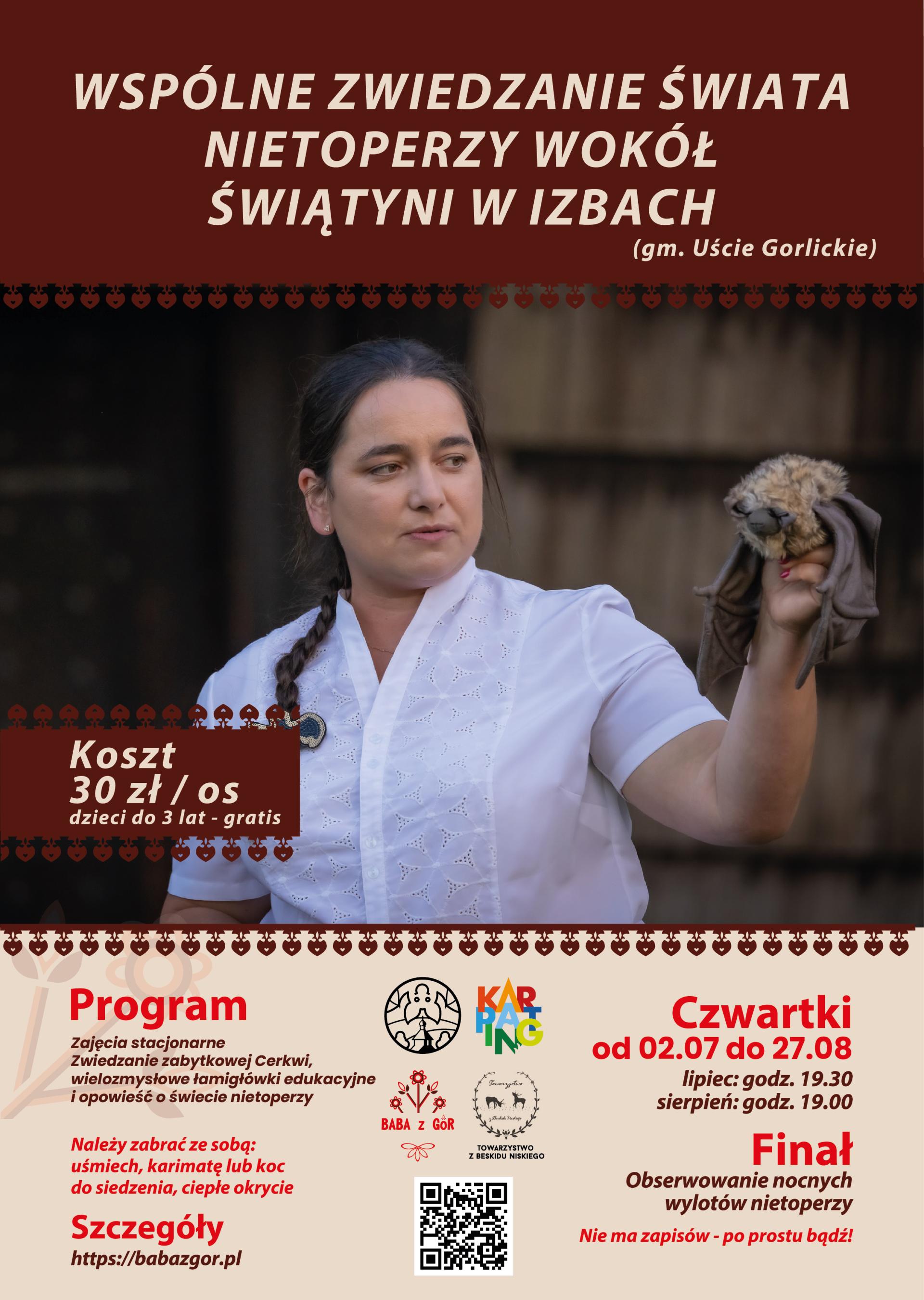Serdecznie zapraszam na spotkanie w którym połączymy opowieści o ludziach, architekturze i przyrodzie w lekkiej wakacyjnej formie. Spotkanie rozpoczniemy od zwiedzania zabytkowej świątyni (dawnej cerkwi greko-katolickiej). Czas trwania zwiedzania: 15 minut (taki mi dzieci dają limit; mieszczę się w tym czasie!). Następnie przejdziemy na łąkę wokół świątyni i przez około 45 minut będziemy w wakacyjnym klimacie edukacyjnym poznawać świat nietoperzy. Wspólnie rozwiążemy łamigłówki, zaśpiewamy piosenkę, założymy na czas spotkania nietoperzowe rekwizyty, poznamy pluszową drużynę nietoperzy i zostaniemy fanami podkowca małego.